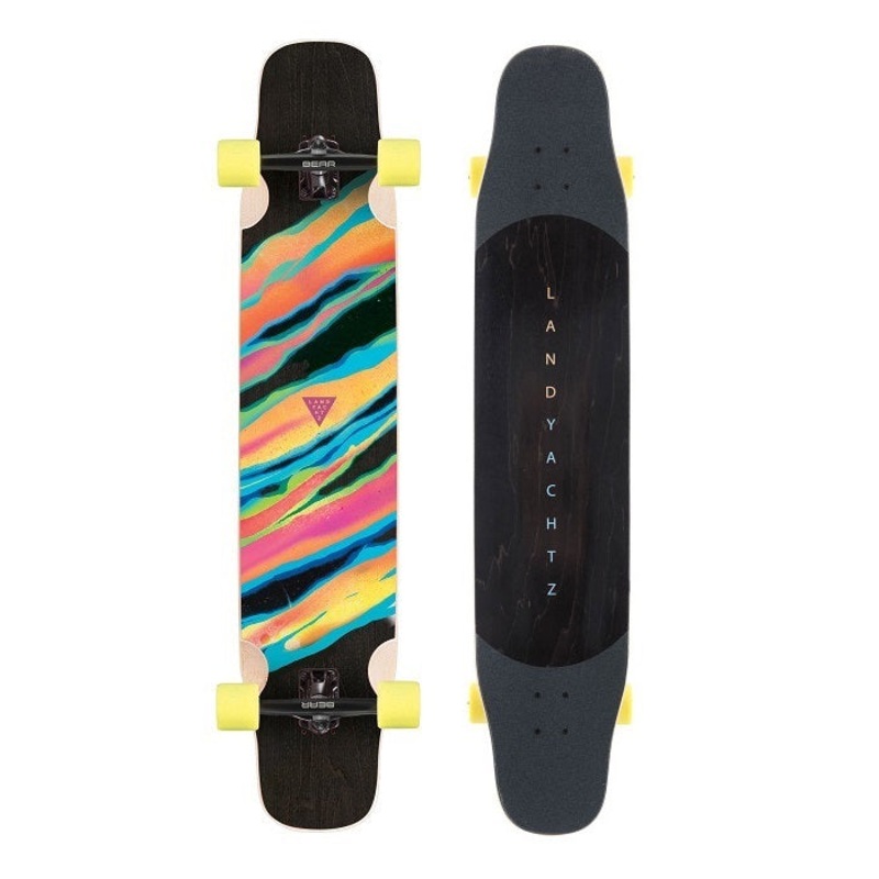 The Stratus 46 is a flexy longboard shape designed specifically for freestyle and longboard dancing. At 45.5 long by 9.25 wide, with griptape only where you need it, this board has plenty of space for all of your cross-stepping needs. The Stratus Spectrum uses an 8 ply Canadian Maple construction to give a nice medium flex feel that returns lots of energy out of each turn but still gives you a confident feeling when landing tricks. The shape has been modified slightly this year to work with the new Grizzly Gen 6 180mm trucks while still having tons of pop. The Stratus rolls on 63mm Fatty Hawgs to keep the complete light and let you run your trucks nice and loose without worrying about wheelbase.