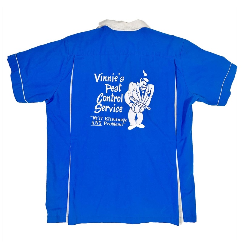 A Vintage Blue & White Bowling shirt with the most badass back graphic ever to hit a bowling shirt. The back has an advertisement for Vinnie’s Pest Control who “Will Eliminate ANY Problem!” Right Sleeve has a bowling pin dude embroidered in white. White contrast piping on sleeves, and white extension pleats on back. In very nice vintage condition with very minimal wear. The back screenprint is peeling off at the top right, on the mobster’s head. In order to We preserve the graphic we recommend only hand-washing, and not putting it in the dryer. Made of 100% cotton and one stain found under right armpit.